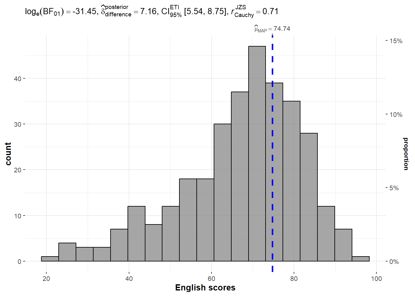 exam_data <- read_csv("data/Exam_data.csv")gghistostats() methodIn the code chunk below, gghistostats() is used to to build an visual of one-sample test on English scores, with default information: - statistical details - Bayes Factor - sample sizes - distribution summary.