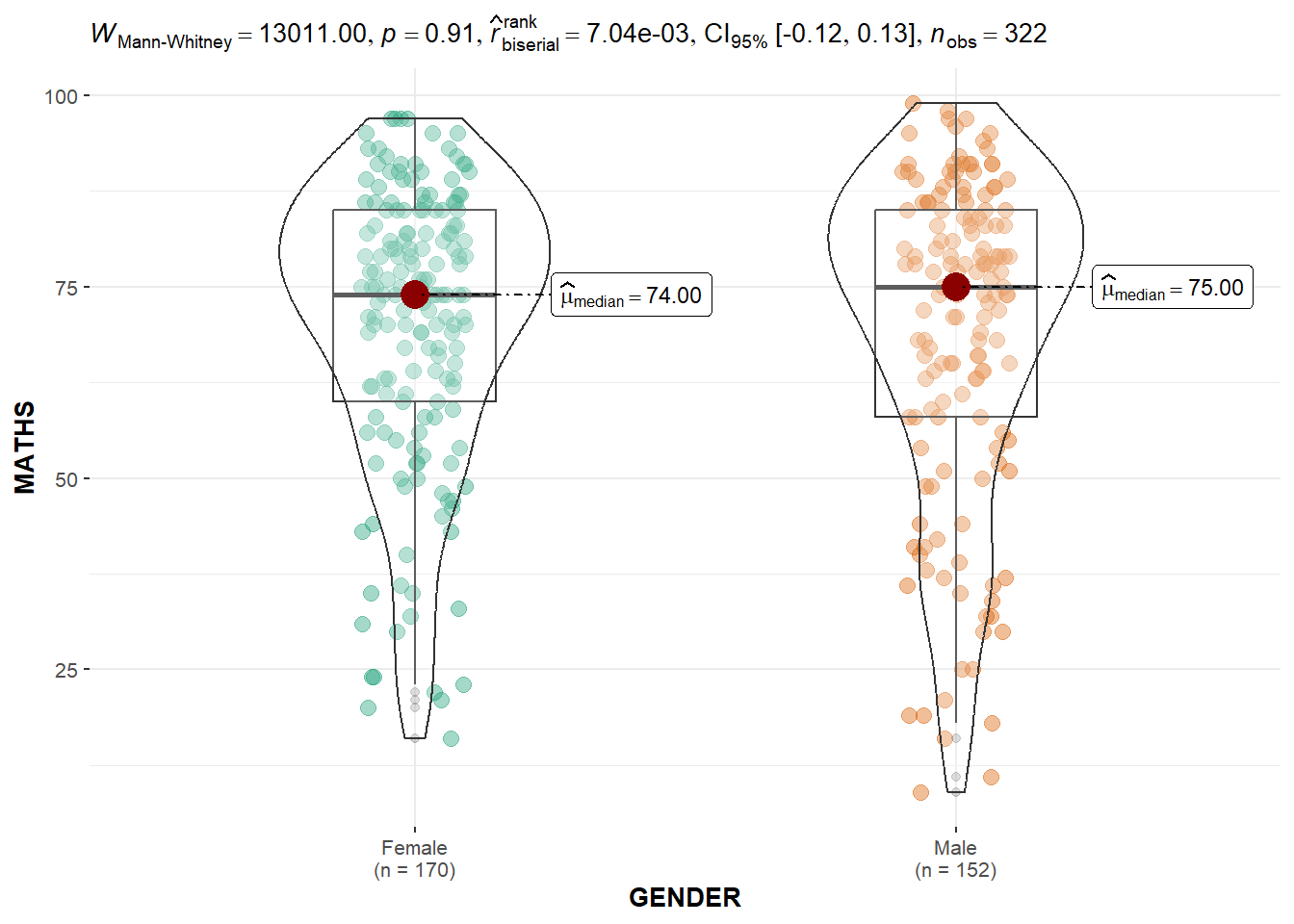 ggbetweenstats() methodThe code chunk below shows ggbetweenstats() being used to build a visual for two-sample mean test of Maths scores by gender.Default information: - statistical details - Bayes Factor - sample sizes - distribution summary