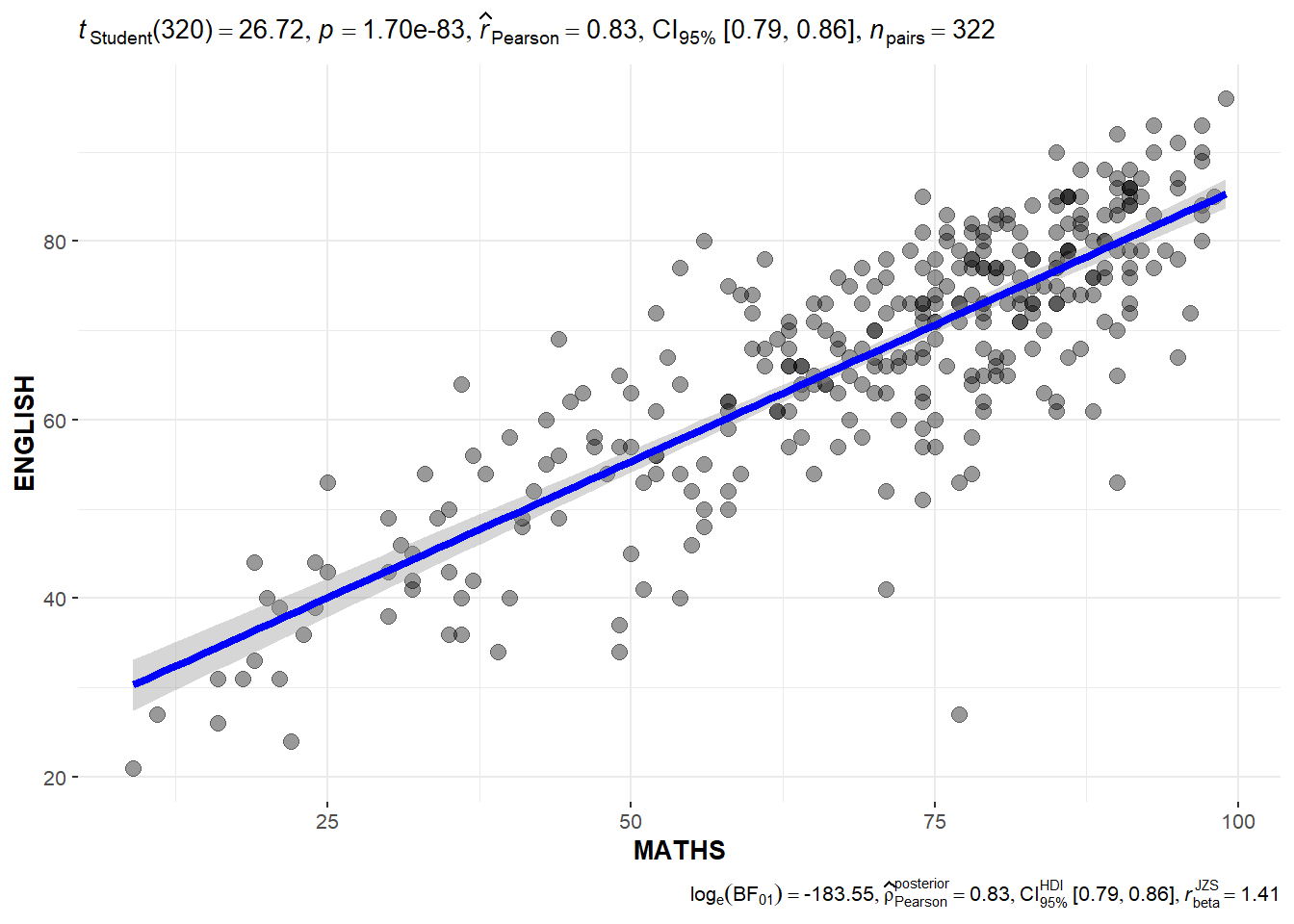 ggscatterstats() methodThe code chunk below shows ggscatterstats() being used to build a visual for Significant Test of Correlation between Maths scores and English scores.