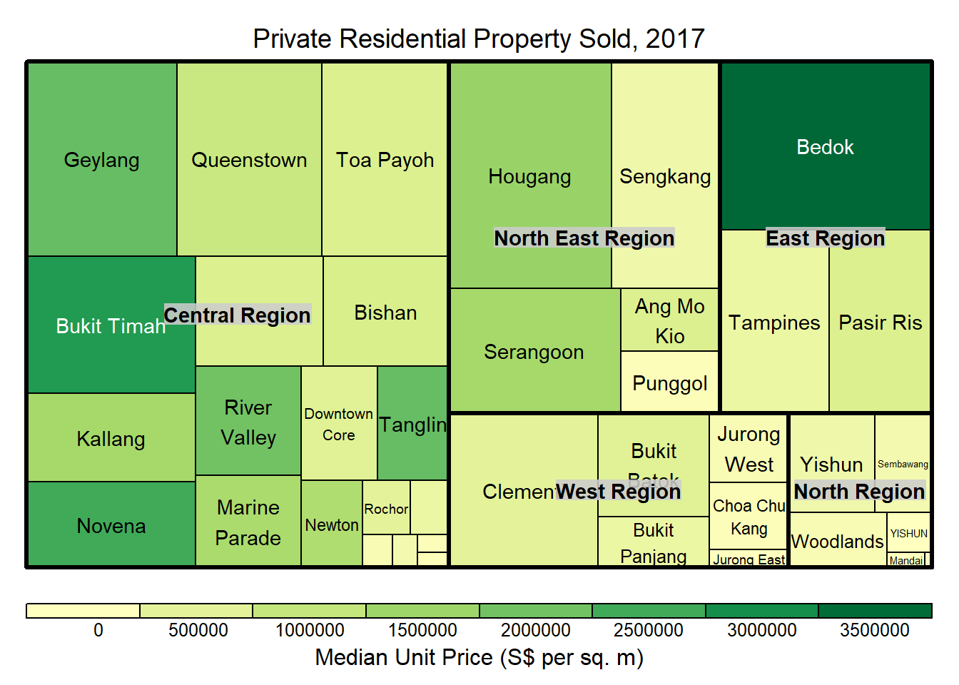 • The rectangles are coloured with different intensity of green, reflecting their respective median unit prices.
