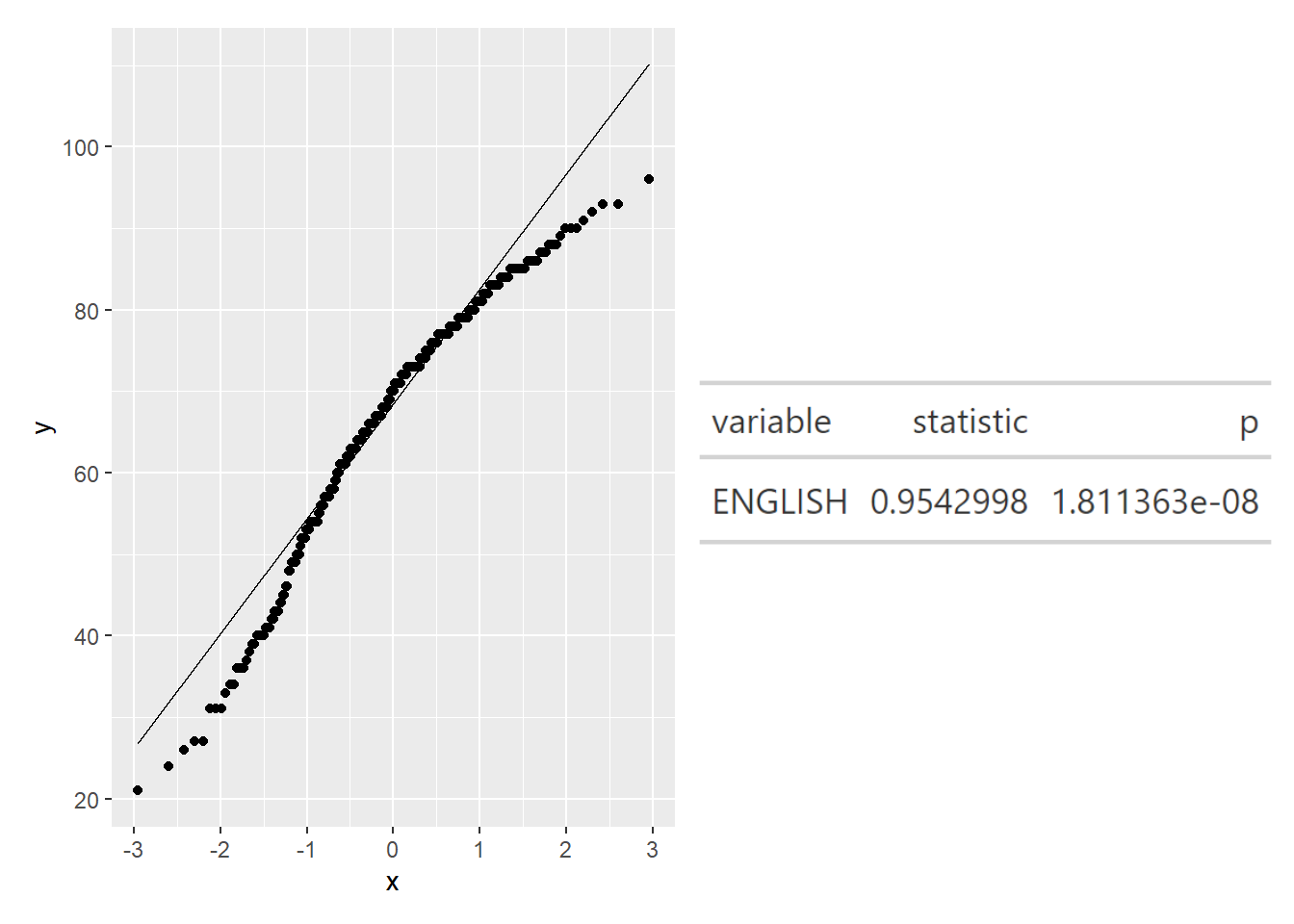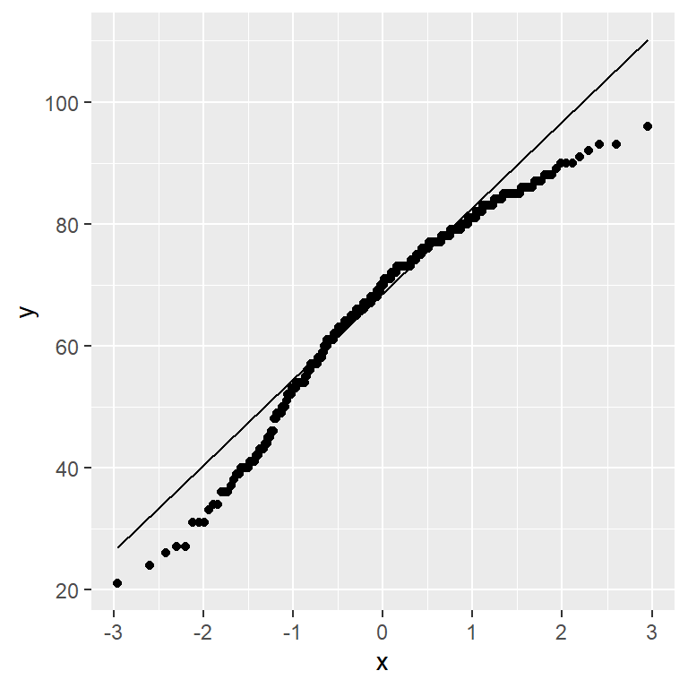 if the data is normally distrbuted, the points in a Q-Q plot will lie on a straight diagonal line. Conversely, if the points deviate significantly from the straight diagonal line, then it’s less likely that the data is normally distributed.