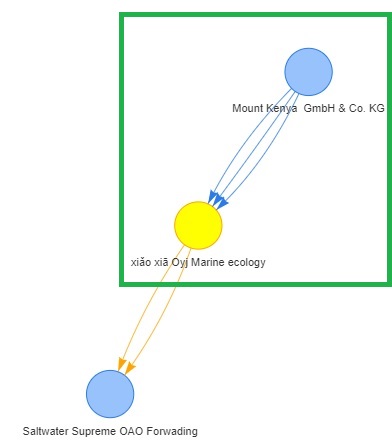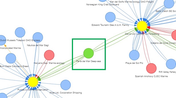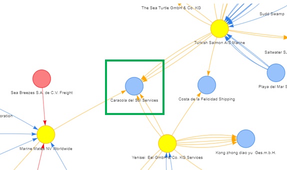 The second image shows that ‘Caracola del Sol Services’ is the key node that connects the 3 nodes (‘Marine Mates NV Worldwide’, ‘Yenisei Eel GmbH & Co. KG Services’ and ‘Turkish Salmon A/S Marine’) with high betweenness indices.