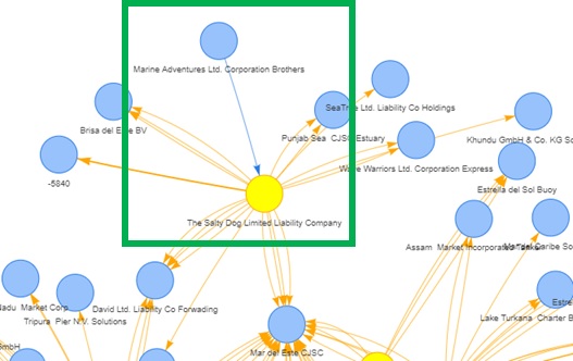 type = "curvedCW"))It is observed that while most of the nodes in this top 10 entities with high out-degree centrality indices, only have outgoing connections to the external nodes, the #1 entity at the top of the list, “The Salty Dog Limited Liability Company”, actually has an incoming connection from another node, “Marine Adventures Ltd. Corporation Brothers”. Hence, we will take a closer look at the exchanges between them.