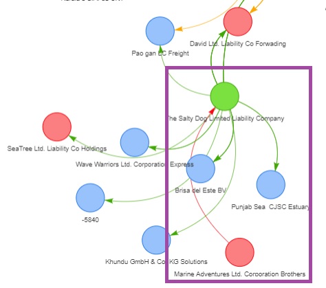 The image above shows that ‘Perla del Mar Deep-sea’ is the key node that connects the 2 nodes (‘Punjab s Marine Conservation’ and ‘David Ltd. Liability Co Forwading’) with high betweenness indices.