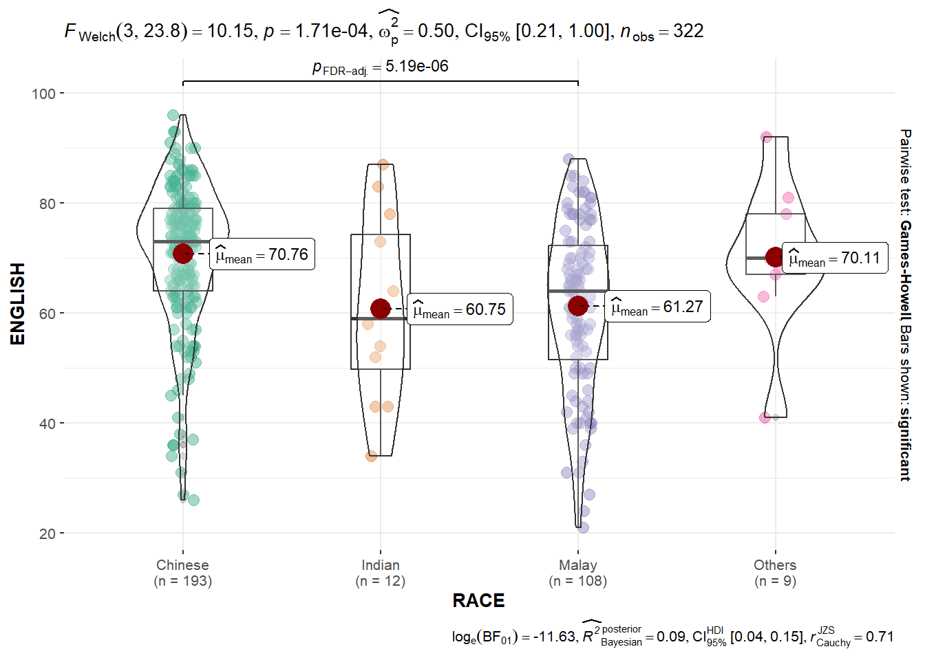 ggbetweenstats() methodThe code chunk below shows ggbetweenstats() being used to build a visual for One-way ANOVA test on English score by race.
