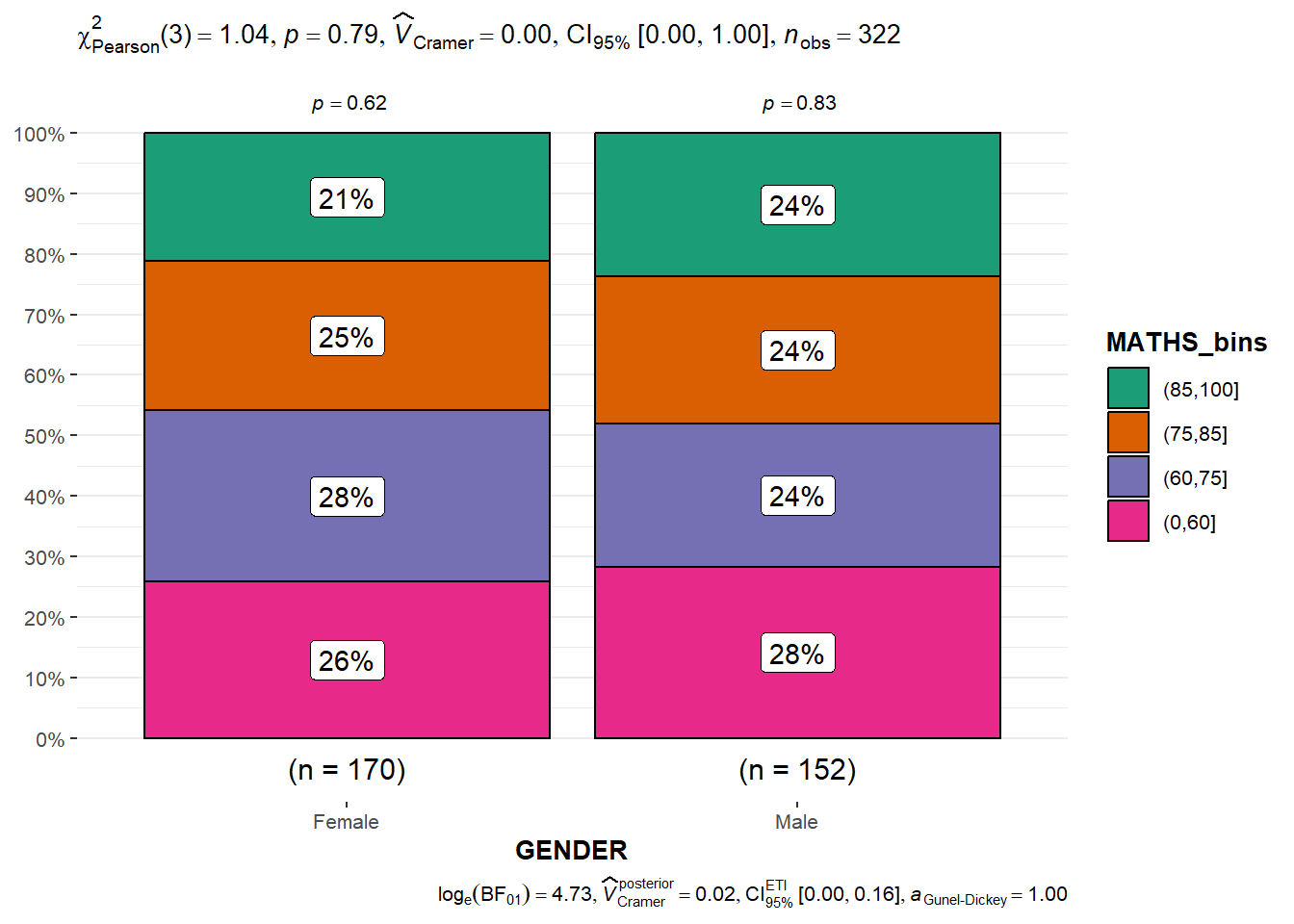 ggbarstats() methodsIn the code chunk below, the Maths scores is binned into a 4-class variable by using cut().