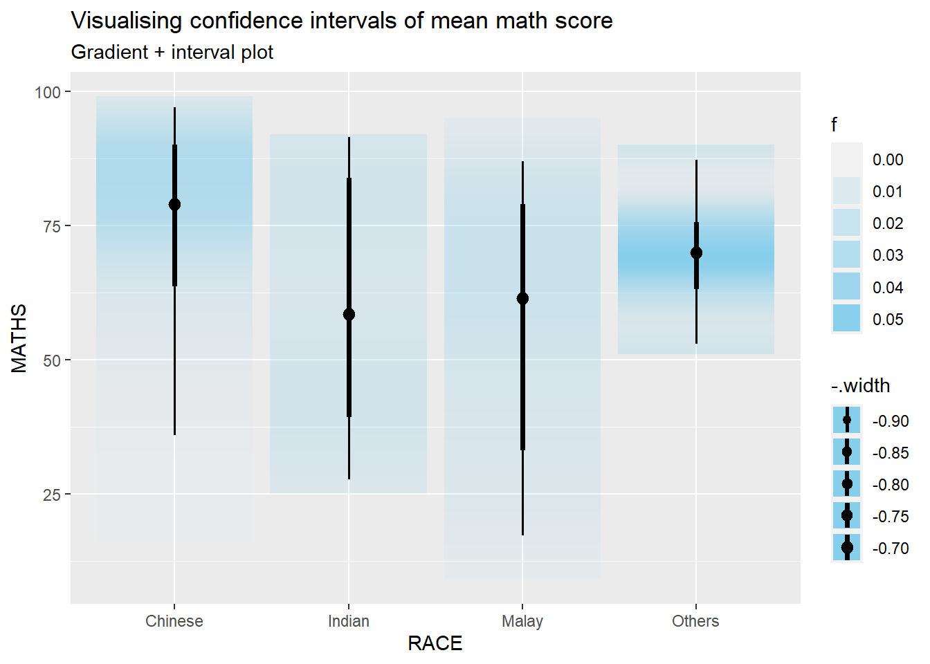 In the code chunk below, stat_gradientinterval() of ggdist is used to build a visual for displaying distribution of maths scores by race.