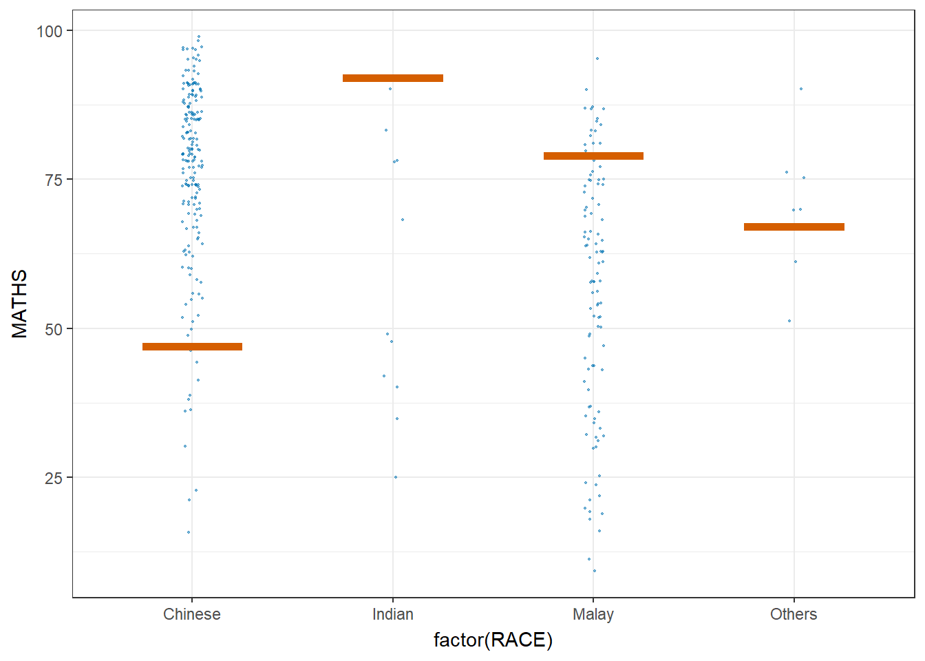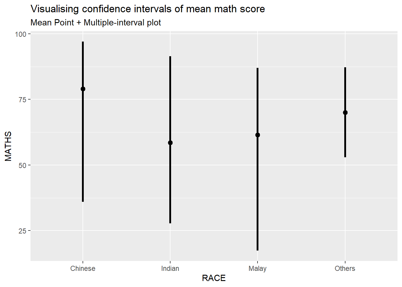In the code chunk below, stat_pointinterval() of ggdist is used to build a visual for displaying distribution of maths scores by race.