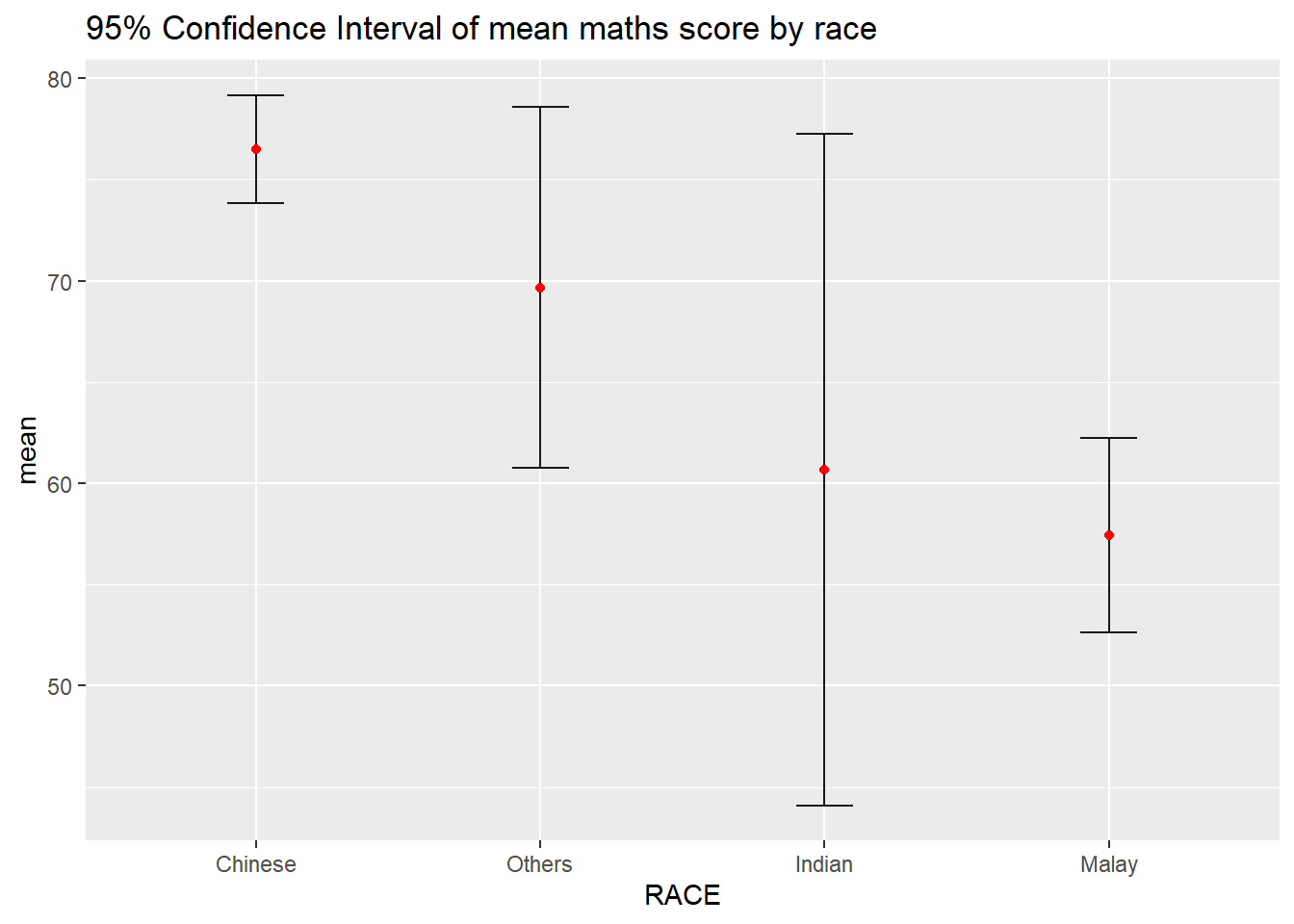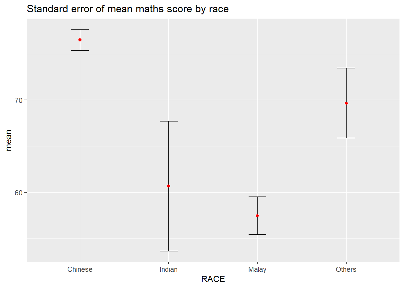 The code chunk below is used to reveal the standard error of mean maths score by race.